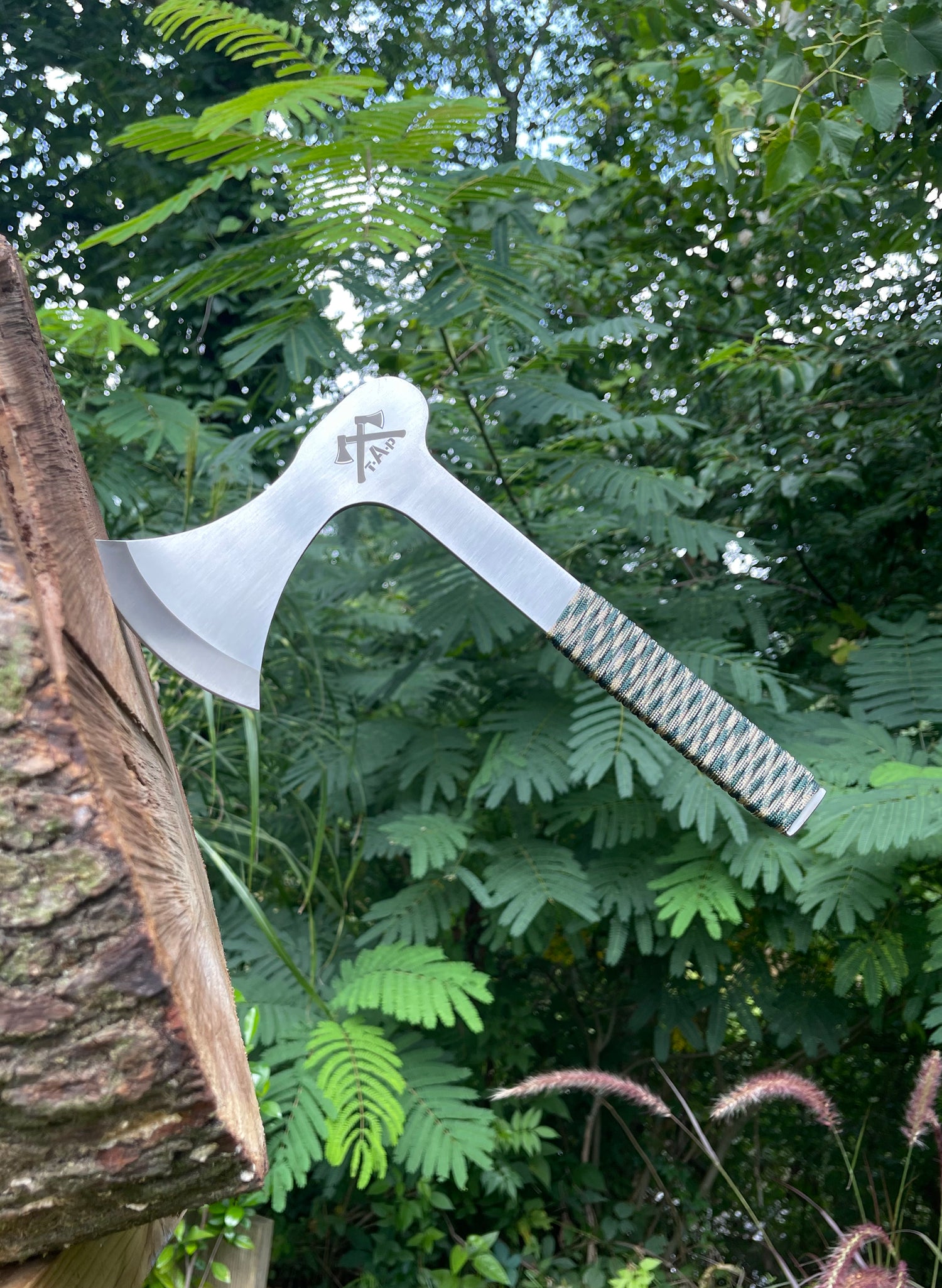 Anyone who throws axes regularly has hit the handle of an axe they have already stuck while throwing a second axe. The wood handles get chummed up and can be hard to replace, and the plastic/rubber handles chunk or break. We have a single-piece design wrapped with paracord, which can be quickly re-wrapped if struck by a second blade flying in from behind. If you hit the stainless steel neck of the axe, it can be easily filed down to remove nicks. Long story short - broken, messed up handles are a thing of the past. And the initial wrap-job will be tighter than almost any factory wrap on earth because I care about the process that makes our products.